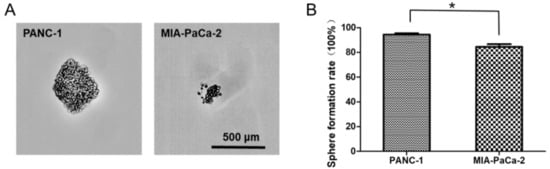 The sphere formation ability of PANC-1 and MIA-PaCa-2. (A) Sphere images of PANC-1 and MIA-PaCa-2 cells after nine days culture. (B) The difference of sphere formation rate between PANC-1 and MIA-PaCa-2 cells. Data are presented as the mean ± standard deviation (SD) of three independent experiments. *P < 0.05 in comparison with the corresponding cells using Student’s t-test.