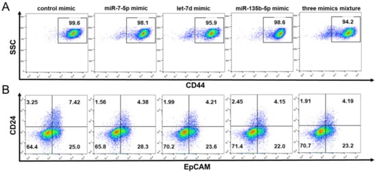 Flow cytometry analysis of pancreatic cancer stem cell surface markers CD24, CD44 and EpCAM in PANC-1 cells transfected with miRNA mimics. (A) The percentage of CD44+ cells in PANC-1 was 99.6%, transfected with miR-7-5p, let-7d, miR-135b-5p and three mixture mimics was 98.1%, 95.9%, 98.6% and 94.2%, respectively. (B) The percentage of CD24+EpCAM+ cells in PANC-1 was 7.42%, transfected with miR-7-5p, let-7d, miR-135b-5p and three mixture mimics was 4.38%, 4.21%, 4.15% and 4.19%, respectively.