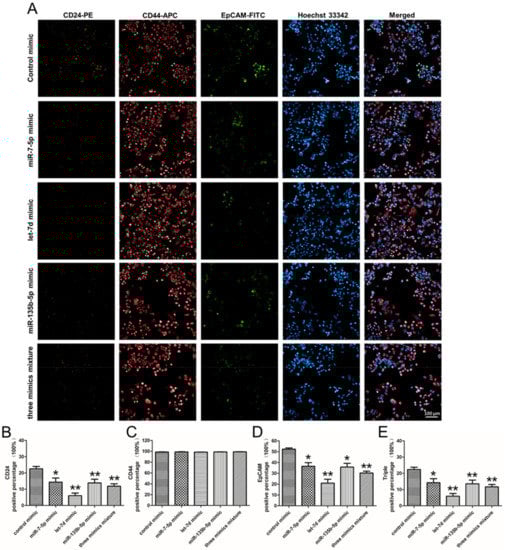 Furthermore, the presence of CSC-related surface markers was also determined by immunocytochemistry (Figure 7A). Different from the results of flow cytometry analysis that the expression of surface marker altered slightly, after PANC-1 treated with miRNA mimics, the percentage of CD24+ cells, EpCAM+ cells and CD24+CD44+EpCAM+ cells almost halved by immunocytochemistry tests (Figure 7B,D,E). Especially for PANC-1 cell line transfected with let-7d mimic, the CD24+, EpCAM+ and CD24+CD44+EpCAM+ cells decreased from 22.6 ± 2.5%, 52.3 ± 1.9% and 22.4 ± 2.4% to 6.0 ± 2.9%, 21.0 ± 6.2% and 5.9 ± 2.9%. However, the percentage of CD44+ cells did not evident change (Figure 7C). These results of surface marker analysis indicated upregulation of miRNAs (miR-7-5p, let-7d and miR-135b-5p) in PNAC-1 could inhibit the CSC-related surface marker expression.