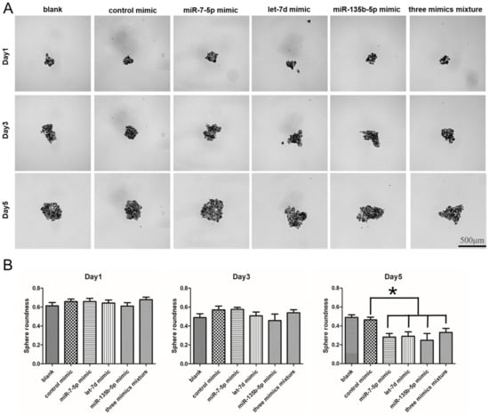 Following the expression of stem cell surface markers analyzed, we checked the sphere formation ability of PANC-1 with miRNA mimics (miR-7-5p mimic, miR-135b-5p mimic, let-7d mimic and negative control mimic) transfected. Results showed that all groups of PANC-1 with different treatments could form spheres. However, the blank and control groups formed tighter 3D spheres with higher sphere roundness (Figure 8). On the day 1 and 3, the sphere roundness showed no significant difference. While on the day 5, the miR-7-5p mimic, let-7d mimic, miR-135b-5p mimic and three mimics mixture treated groups showed looser 3D spheres with low sphere roundness. The sphere roundness was 0.28 ± 0.07, 0.29 ± 0.1, 0.25 ± 0.12 and 0.33 ± 0.10 for miR-7-5p, let-7d, miR-135b-5p and three mixture mimics treated, respectively, while blank and control group was 0.49 ± 0.06 and 0.46 ± 0.06 (Figure 8B). The results illustrated that the sphere formation ability (sphere roundness) declined in PNAC-1 when miRNA mimics treated, but no significant difference between single mimic and three mimics mixture transfected group.