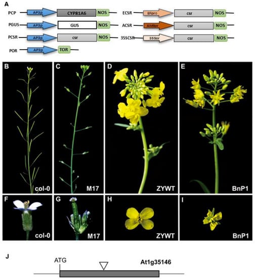 (A) Schematic illustration of constructs used to transform Arabidopsis and rapeseed. Arrows indicate the promoters. The fragments were cloned to the expression sites of pCAMBIA2300; (B) feature of a wild silique of Arabidopsis; (C) feature of a male sterile transgenic line without petals and stamens of Arabidopsis; (D) rapeseed with normal inflorescence; (E) transgenic inflorescence of rapeseed (BnP1) with defective petals; (F) a wild flower with normal petals of Arabidopsis; (G) a male sterile transgenic Arabidopsis flower without petals and anthers on top of a filament; (H) a wild flower of rapeseed; (I) a transgenic flower of rapeseed (BnP1) with wizened petals; (J) DNA insertion occurred in the exon of At1g35146 based on the results from TAIL-PCR analysis. Grey box: Exon; grey lines: Intergenic sequences; black triangles: Location of transgenes.