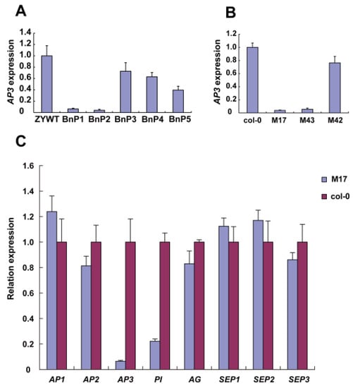 RT-PCR analysis of selected target genes. (A) AP3 expression of transgenic rapeseed BnP1 and BnP2 with severe morphological defects and BnP3, BnP4, and BnP5 with slight morphological defects, ZYWT (wild-type); (B) AP3 expression of transgenic Arabidopsis M17, M43 with morphological defects, and M42 with no defects, Col-0 (wild plant)(http://katahdin.mssm.edu/kismeth/revpage.pl) [,,]; (C) the levels of class A, B, and C transcripts. All the rapeseed (P1–P5) and Arabidopsis (M17, M42, M43) transgenic lines contain the PCSR construct. The expression levels were controlled using the signal from the ACTIN gene. The average (±SD) values are shown from three biological duplicates of quantitative reverse transcription PCR.