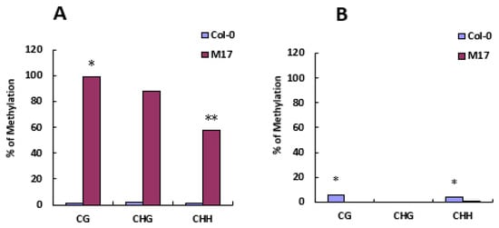 DNA methylation analysis of Col-0 and M17 by bisulfite sequencing. (A) DNA methylation analysis of AP3 promoter (B) DNA methylation analysis of PI promoter. The percentage of methylation on CG, CHG, and CHH sites are shown and T test analysis of methylation differences in the group (* p < 0.05, ** p < 0.01).