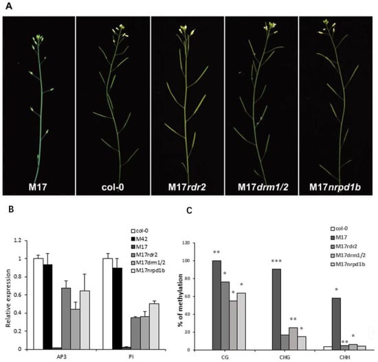 To further confirm that the DNA methylation of AP3 promoter is responsible for the ap3-like phenotypes in M17, a complementation test was conducted as follows: M17 was crossed with null mutants sgs3-11 and rdr6-11 as SGS3 and RDR6 are required for PTGS []; M17 was also crossed with rdr2-2, drm1/2, and nrpd1b-11, which release the silencing of a reporter gene through the RdDM pathway. Among the examined F1 plants, lines with the PCSR construct showed the same phenotypes as M17. Then, double heterozygous plants (identified by genomic PCR) were chosen to be pollinated with pollens from the null mutants. In the BC1 generation, the morphological defects were fully complemented only in the lines with rdr2-2, drm1/2, and nrpd1b-11 as the pollen donors (Figure 5A), whereas those lines containing rdr6-11 and sgs3-11 homozygote were not recovered due to fact that SGS3 and RDR6 were not present in the pathway of RdDM. We also analyzed the AP3 expression, PI expression, and DNA methylation levels of AP3 promoter by bisulfite sequencing in the complementation lines. In comparison with M17, the high methylation of the AP3 promoter was substantially decreased at all the three cytosine contexts (CG, CHG, and CHH), and the reduced expression of AP3 and PI were rescued in the complementation lines (Figure 5B,C). These results suggest that the morphological defects were controlled by RdDM. It was possible that the transgenic construct of AP3 promoter may have generated siRNA and caused the DNA methylation of the AP3 promoters, resulting in the decrease of AP3 expression and obvious defects in floral morphology.