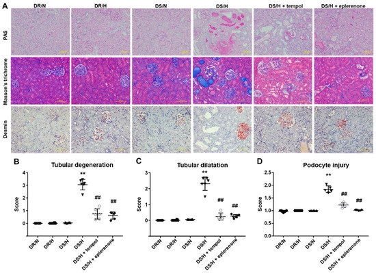 Histopathological examination of kidney tissues. Representative photomicrographs of periodic acid-Schiff (PAS), Masson’s trichrome staining and immunostaining for desmin of the kidney cortical regions (A). Tubular degeneration and dilatation were assessed using a semiquantitative score from 0 to 4, with 0 representing no damage and 4 representing severe damage (B,C). Podocyte injury marker desmin was assessed using a semiquantitative score from 0 (0%) to 4 (51% to 75%) for each animal (average per animal from 30 selected glomeruli) (D). Values are represented as means ± SE (n = 5–6). **, p < 0.01 vs. DS/N rats. ##, p < 0.05 vs. DS/H rats. Scale bar, 100 μm.