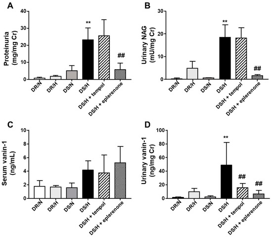 Evaluation of traditional or newly developed biomarkers. At four weeks after normal-salt or high-salt diets, 12 h urine or serum samples were collected for each group (A–D). Concentrations of proteinuria, urinary NAG, and urinary vanin-1 were normalized to the urinary creatinine concentration. Values are presented as means ± SE (n = 6). **, p < 0.01 vs. DS/N rats. ##, p < 0.01 vs. DS/H rats.