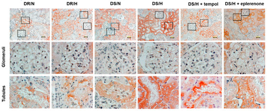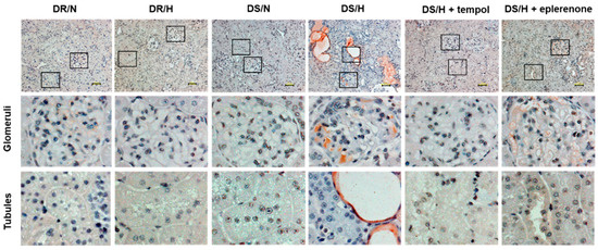 Immunohistochemical analysis showed that there was an increased expression of 4-HNE, which is an oxidative stress marker, in damaged tubules with prominent expression in the renal tubular cells (Figure 5). Of note, the tubular staining level for 4-HNE appeared to be stronger in the DS/H than that in the DS/N, and it was attenuated in eplerenone- or tempol-treated rats.