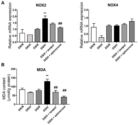 Evaluation of oxidative stress. Analysis of the renal gene expression of Nox2 and Nox4 (A) and MDA content (B). MDA, malondialdehyde. Values are presented as means ± SE (n = 6). **, p < 0.01 vs. DS/N rats. ##, p < 0.01 vs. DS/H rats.