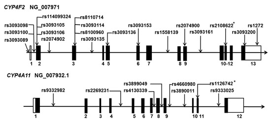 Genetic polymorphisms in human CYP4F2 and CYP4A11. Localization of single nucleotide polymorphisms (SNPs) in genomic DNA of CYP4F2 (upper panel, NG_007971) and CYP4A11 (lower panel, NG_007932.1). Numbers indicate the order of exons. Solid portions of exons indicate transcription regions. Open frames on exons indicate non-transcription regions of CYP4F2 and CYP4A11. Published RefSNPs (rs) numbers linked with hypertension and stroke are listed. Asterisks (*) indicate that the SNPs are also associated with other diseases, including cardiovascular disease and kidney transplantation.