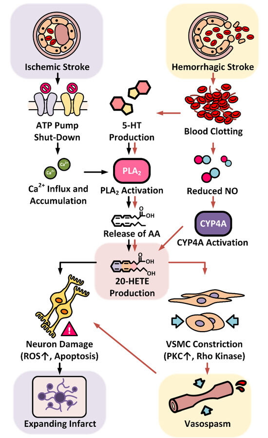 Indeed, the link between 20-HETE and hypertension is complicated as 20-HETE promotes the effects of vasoconstrictors to increase blood pressure in some models but reduces blood pressure by inhibition of sodium transport in the kidney in other models [12,33]. The complicated relationship between 20-HETE and stroke is thus expected, not only because of the conflicting roles of 20-HETE, but also because of the complexity of the onset, development, and prognosis in different types of stroke. This review addresses the conflicting roles of 20-HETE in hypertension and stroke by dissecting the molecular mechanisms of 20-HETE and its contribution at various stages of ischemic and hemorrhagic stroke.