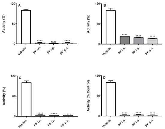 Effect of in vivo PF administration on FAAH activity. Inhibition of (A) hippocampus, (B) cortex, (C) cerebellum and (D) liver FAAH activity after the three different routes (i.n., i.p. or p.o.) of PF or vehicle administration. Results are means ± SEM expressed as percentage of the maximum effect observed in absence of PF plus vehicle administrated by the different routes. **** p < 0.0001 post hoc comparisons with vehicle conditions, Tukey’s test.