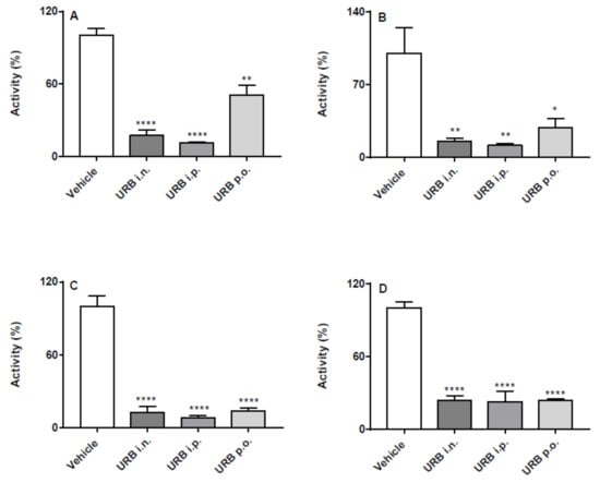 Effect of in vivo URB administration on FAAH activity. Inhibition of (A) hippocampus, (B) cortex, (C) cerebellum and (D) liver FAAH activity after the three different routes (i.n., i.p. or p.o.) of URB or vehicle administration. Results are means ± SEM expressed as percentage of the maximum effect observed in absence of URB plus vehicle administrated by the different routes. * p < 0.05, ** p < 0.01 and **** p < 0.0001 post hoc comparisons with vehicle conditions, Tukey’s test.