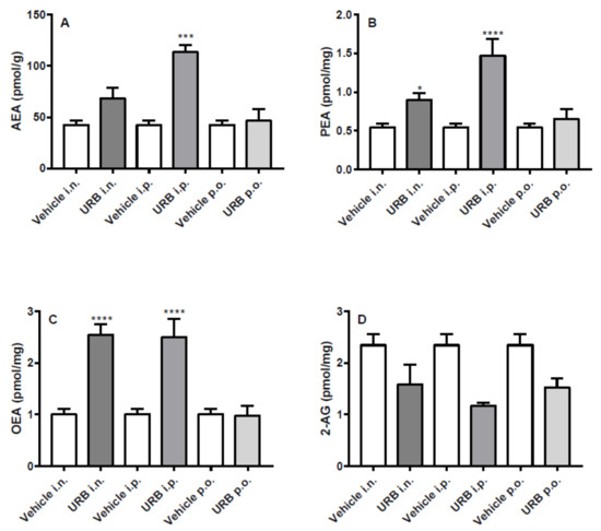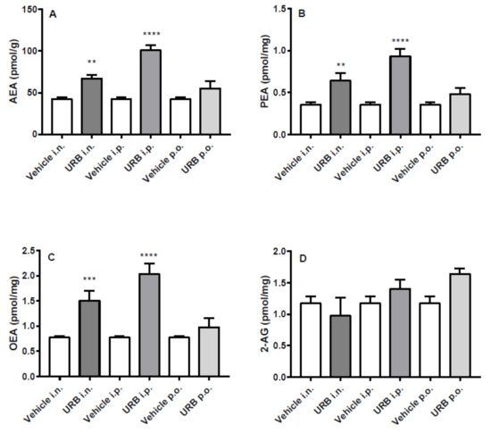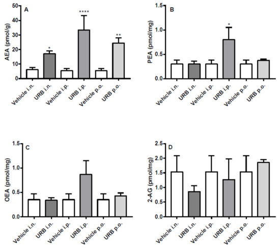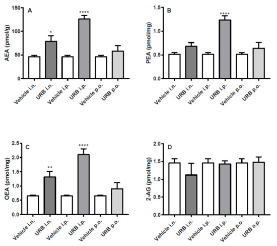 All three NAEs measured increased in the cortex of mice after i.p. or i.n. URB administration, while no differences were observed in p.o.-administered group (Figure 4A–C). Instead, the different routes of URB administration did not affect 2-AG levels (Figure 4D).