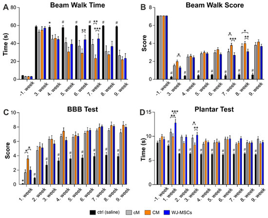 Results of behavioral testing. The locomotor and sensory function of animals were tested by a beam walk time measurement (A), beam walk score (B), Basso, Beattie and Bresnahan test (BBB) test (C) and plantar test (D). The number of animals in the groups is as follows: Saline treated control group n = 16, cM group n = 11, CM group n = 10 and WJ-MSCs group n = 12. Asterisks (*) and (#) above ctrl (saline) group columns show statistical significance of ctrl (saline) group vs. all particular treatments, which was * p < (0.05–0.01) and # p < 0.001. The significance between the treated groups: * p < 0.05, ** p< 0.01 and *** p < 0.001.