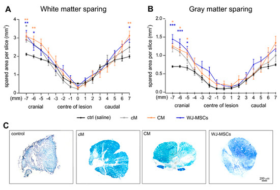 The treatment effect on the sparing of white and gray matter was evaluated 9 weeks after the SCI using cresyl-violet luxol fast blue stained serial cross sections (Figure 4). The significant tissue sparing was found in the CM and WJ-MSCs group in both the cranial and caudal parts of the lesion in the white matter (Figure 4A), and in the cranial part of the lesion in the gray matter when compared to saline treated control animals (Figure 4B). The cM treatment revealed a tendency of improvement in tissue sparing similarly as WJ-MSCs and CM, however it was statistically significant only in the cranial part of the white matter.