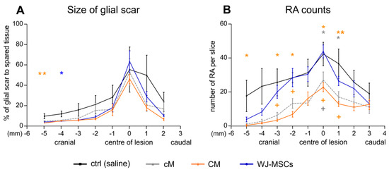Glial scar formation analyses. (A) The size of glial scar expressed as the % to spared tissue. (B) Number of reactive astrocytes (RA) counted from the glial fibrillary acidic protein (GFAP) staining as shown in Figure 6. Number of animals: Saline treated control group n = 4, cM group n = 5, CM group n = 5 and WJ-MSCs group n = 5. Asterisks (*) show statistical significance of particular treatment, when compared to saline treated control group, crosses marks (+) show statistically significant difference between WJ-MSCs group and CM group (orange cross) and between WJ-MSCs group and cM group (gray cross), respectively. * p < 0.05, ** p < 0.01 and + p < 0.05.