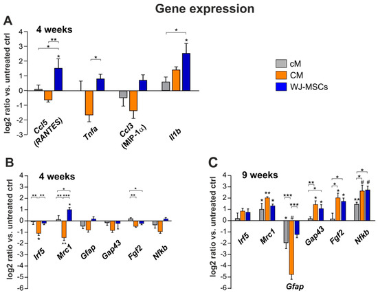 In the case of Gfap expression, no significant changes were detected after 4 weeks, while after 9 weeks, a significant down-regulation was found in the CM and cM group, but not in the WJ-MSCs group when compared to the saline treated control. Moreover, the down-regulation of GFAP in CM group was statistically significant, when compared to both the WJ-MSCs and cM group, respectively.