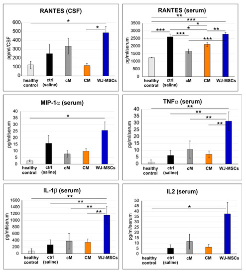 The level of IL-1β, IL-2, IL-4, IL-6, IL-10, IL-12p70, IFN-γ, MIP-1α (CCL3) and RANTES (CCL5) was analyzed 4 weeks after SCI in blood serum and in the cerebrospinal fluid (CSF; Figure 9). From all these markers, only RANTES was found above the detection limit in both the serum and CSF, and TNF-α, MIP-1α, IL-1β and IL-2 were detected in the serum. Of note, all these detected markers were significantly increased after the treatment with WJ-MSCs, which suggests a systemic immunological response to the xenogeneic cell transplantation. In CSF, the RANTES level was significantly higher after WJ-MSCs treatment than in the healthy control (p < 0.05) and after CM treatment (p < 0.05). In the serum, the RANTES level significantly increased in untreated (saline) lesion (p < 0.001), WJ-MSCs (p < 0.001) and CM (p < 0.01) groups when compared to the healthy control levels. RANTES in CM and cM were significantly lower than the values in untreated lesion (p < 0.05 and p < 0.001), and also after the treatment with WJ-MSCs (p < 0.01 and p < 0.001). Moreover, the level of RANTES in the serum was significantly higher after CM than after cM treatment (p < 0.05). Significantly higher levels of MIP-1α and IL2 were found after WJ-MSC treatment when compared to the healthy control levels (both p < 0.05). TNFα and IL-1β enhancement after WJ-MSC treatment was significantly higher when compared to all other groups (all p < 0.01).