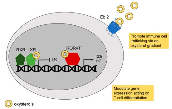 Molecular targets of oxysterol implicated in autoimmunity. Oxysterols have different targets during autoimmune diseases. Oxysterols promote immune cell trafficking through Ebi2 receptor expressed on cell surface. Oxysterol-Ebi2 interaction allows the cells to migrate via an oxysterol-gradient dependent manner. The liver X receptor (LXR) and RORγT are members of the nuclear receptors’ family of transcription factors involved in immune cell differentiation. Through those transcription factors, oxysterols modulate the gene expression implicated in inflammatory and autoimmune processes.