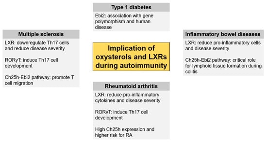 Through work over the last several decades, it is now recognized that cholesterol metabolites, in particular oxysterols, are involved in fine-tuning the immune responses and contribute to the development of several autoimmune diseases, including MS, IBD, RA, and possibly T1D. The complexity of oxysterol downstream pathways with several intracellular nuclear factors as well as with membrane surface receptors certainly contributes to the different implications of oxysterols pathways during autoimmunity. The precise contribution of both LXR-dependent and independent pathways is still largely undetermined in this context. It thus remains a field that needs to be further investigated to fully understand how oxysterols are generated and participate to autoimmunity. By understanding the precise role of cholesterol pathways during inflammation, we can anticipate the emergence of new therapeutic treatments to tackle autoimmune diseases.