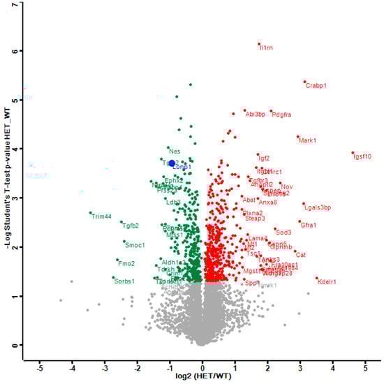 This Volcano plot represents all significant dysregulations in the global proteome of LonP1+/− mouse embryonal fibroblasts (MEFs) (heterozygous mutant (HET)) in green color (downregulated), red color (upregulated) or blue color (genetically deleted). The two-fold deficiency of LonP1 is represented by log2 ratio as –1 on the X-axis. Significance values are shown on the Y-axis. Peptides with non-significant changes are shown as grey dots. Factors of high significance despite moderate fold-change such as LonP1 can be easily distinguished in this diagram from other factors of massive fold-changes with higher variability such as the longevity and health span factor Fmo2 [].