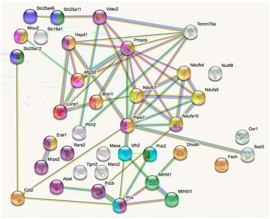 For protein–protein-interaction (PPI) network analysis, the software tool STRING (Search tool for the retrieval of interacting genes) v.11.0 (https://string-db.org/) with standard settings was used to visualize networks among factors with nominally significant difference between HET and WT status, using three biological replicates []. Automated network statistics were performed; significant functional enrichments of GO (Gene Ontology terms regarding biological processes, molecular functions, cellular components), KEGG pathways, REACTOME pathways, PFAM protein domains, INTERPRO Protein Domains and Features, and SMART protein domains were exported into Excel files. Pathway findings were processed further into tables for dysregulated (p-values < 0.05) mitochondrial factors, oxidative stress, and glutathione factors, innate immunity factors as well as lysosomal factors.