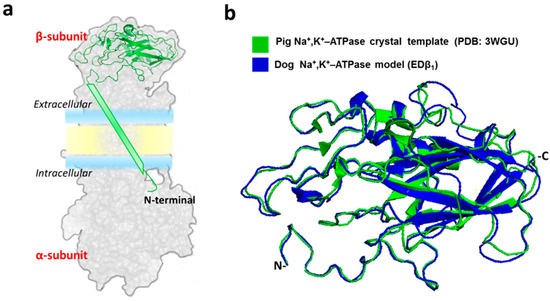 Generation of a high-quality model of canineβ1subunit extracellular domain. (a) The silhouette of the complete pig Na+, K+-ATPase structure (PDB ID = 3WGU). The β1 subunit structure is emphasized in green (cartoon model). (b) Structural alignment between the pig (green) and the canine (blue) β1 subunit extracellular domain, named EDβ1. Our model starts from threonine 60 where the single α-helix of TM domain of β1 the ends.