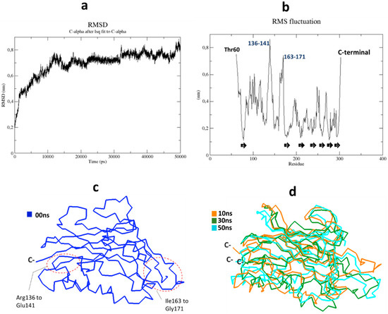 We performed MD simulations of the model using GROMACS package, by employing the OPLS force field for GROMOS (GROMACS 96) [46]. The box dimension was settled at least 2.0 nm away from the wall of the dodecahedral box with periodic boundary condition, solvated with TIP3 water molecules. The system was neutralized up to 0.15 NaCl. Energy minimization was carried out using the steepest descent method. Berendsen temperature coupling and isotropic pressure coupling were established in order to reach a stable environment (300 K 1 bar). To treat electrostatic and Van der Waals interactions, the particle mesh Ewald (PME) algorithm was applied, using the following values, the cut-off for the short-range VdW (rvdw) was set to 1.0 nm and Coulomb cut-off (r coulomb) at 1.0 nm. All the bond lengths were constrained using the LINCS algorithm [47] and the time step was set to 0.002 ps. The complex was equilibrated for 10 ns, and the MD simulation was run for 50 ns. All structural analyses were carried out by means of the program GROMACS [48]. Snapshots of different MD simulations (10 ns, 20 ns, 30 ns, 40 ns and 50 ns) of the trajectory were retrieved for the analysis of the conformational structure of the protein.