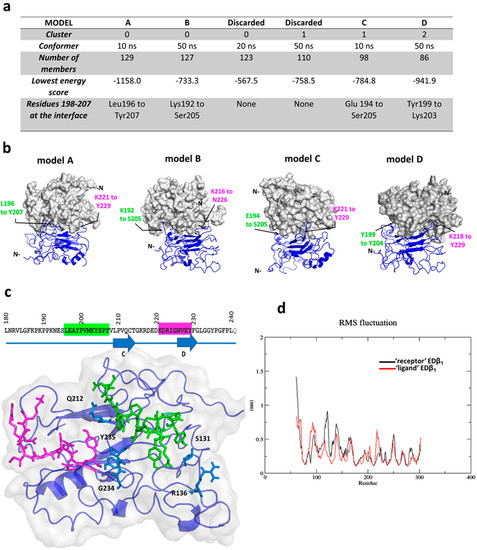 Docking of EDβ1 and description of the interface. (a) Docking results for the top six largest clusters. (b) Models for each of the selected four dimers. One EDβ1 is depicted in surface representation (gray) and the docked EDβ1 in cartoon representation (blue). Black arrows identify amino acid residues within the same segments (magenta for Lys221–Tyr229 and green for Leu196–Tyr207). (c) The interface of model A. The two main segments forming the interface are marked in the β1 subunit sequence keeping the same color code as in (b). Interface residues highlighted in sticks representation. Light blue residues are those that appear at the interface but are non-continuous in sequence. (d) RMSF of model A during 50 ns of Molecular Dynamics simulations.