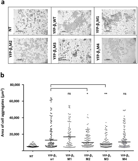 Fibroblasts expressing mutants YFP-β1 M2 and M3 show lower adhesiveness. (a) Representative snapshots of cells submitted to a Dispase assay. (b) Distribution Graph of fragments larger than 5000 μm2. Horizontal bars represent median values, (n = 4) *, significant difference p < 0.05; **, significant difference p < 0.01 and ns = non-significant, non-parametric Mann-Whitney’s test.