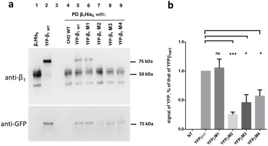 We wondered whether the fusion protein YFP-β1 WT (75 kDa) was capable of interacting with β1His6 (50 kDa). Representative results are shown in Figure 6a. Incubation of YFP-β1 WT with immobilized β1His6 resulted in the detection of both proteins in the eluate fraction. This indicates a positive association in vitro (lane 5, upper panel). In contrast, incubation of non-transfected CHO WT cell lysates with immobilized β1His6 resulted in the detection of only β1His6 in the eluate fraction (lane 4, upper panel). We incubated lysates from each of the YFP-β1 mutant expressing cell lines (M1 to M4) with immobilized β1His6. As expected, eluates blotted with the antibody against the NaK β1 subunits detected a 75 kDa band only for M1 (lane 6, upper panel). As shown in Figure 4b this antibody does not detect M2 to M4. (lanes 7 to 9, upper panel). However, a 75 kDa band was detected for the YFP-β1 WT and the four mutant cell lines (M1 to M4) when eluates were blotted with an anti-GFP antibody (lanes 6 to 9, lower panel). We detected different signal intensity for each of the four mutants. The bar graph in Figure 6b shows the densitometry quantification of immunoblots of each YFP-β1 mutant in relation to that of YFP-β1 WT. YFP-β1 M1 showed no difference from non-mutated YFP-β1 WT. In contrast, YFP-β1 M2 showed a very low signal, a 25% of that of YFP-β1 WT. YFP-β1 M3 and YFP-β1 M4 showed similar levels of approximately 50% decrease in the signal compared to the non-mutated YFP-β1 WT.