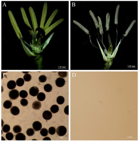 Cytological observation of pollen morphology. (A) The anthers of WXS (F) were yellow and full under the low temperature (~22 °C) and shorter day lengths, and (C) the pollen grains of WXS (F) were deeply stained by iodine-potassium iodide (I2-KI). However, (B) the anthers of WXS (S) were white and shriveled under higher temperatures (> 23 °C) and longer day lengths, and (D) the pollen grains of the WXS(S) were completely absent.