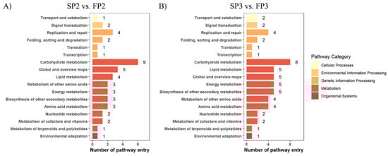 Differentially expressed proteins (DAPs) were defined as proteins with an FC > 1.2 and p < 0.05. In the present study, DAPs were identified at least twice in three biological replicates and had the same change trend. Based on these criteria, we found that 119 DAPs were upregulated, and 144 DAPs were downregulated in SP2 vs. FP2, and 87 DAPs were upregulated, and 162 DAPs were downregulated in SP3 vs. FP3 (Figure S5, Table S3).
