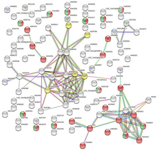 To further clarify the inter-connections among the cor-DEGs-DAPs genes, a STRING (Search Tool for the Retrieval of Interacting Genes/Proteins) analysis was performed to find that the cor-DEGs-DAPs were most enriched in metabolic pathways (the red circles in Figure 3) and in the biosynthesis of secondary metabolites (the green circles in Figure 3). Moreover, we found that a number of heat shock proteins were highly clustered in protein processing in the endoplasmic reticulum (the yellow circles in Figure 3). These proteins might respond to the environmental condition of high temperature in WXS during the fertility transition stages.