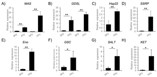 Differential expression levels of eight cor-DEGs-DAPs genes validated by quantitative real-time PCR. The candidate genes were (A) MAS (LOC_Os04g40990.1), (B) GDSL (LOC_Os05g11910.1), (C) Hsp22 (LOC_Os02g52150.2), (D) SSRP (LOC_Os05g08970.1), (E) Eno (LOC_Os01g54860.1), (F) GSC (LOC_Os02g50240.1), (G) SALT (LOC_Os02g18410.1) and (H) KET (LOC_Os02g57260.1). The error bars indicate standard deviation of three replicates. Asterisks indicate a significant difference as determined by student’s t-test (* p < 0.05; ** p < 0.01).