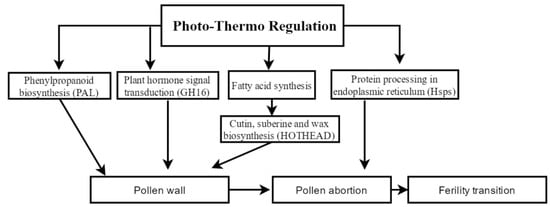 Based on our analysis results and the functions and expression patterns of the cor-DAPs-DPGs proteins, and the above discussion, we proposed a model that might explain the fertility transition in PTGMS rice (Figure 5) in the present study. Initially, the heat shock proteins (Hsps) in the anther responded to the high environmental temperature. Then, the Hsps were involved in the folding and unfolding of other proteins. With the growth and development of rice plants, the Hsps expression was higher in WXS (S) than in the (F), and this result might produce more misfolded proteins that could be involved in pollen abortion. At the same time, plant hormone signal transduction (GH16) was involved in the development of the anther cell wall, and the cuticle is the important part of the pollen wall, and is involved in phenylpropanoid biosynthesis pathways, and biosynthesis of fatty acid. In phenylpropanoid biosynthesis, PAL is a key upstream gene, it has low expression in WXS (S). In fatty acid biosynthesis, 3-hydroxyacyl-CoA dehydrogenase had lower expressions in WXS (S) than in WXS (F). Additionally, in cutin, suberine, and wax biosynthesis, the HOTHEAD precursor had high expression in WXS (S), which could result in the abortion of the pollen in WXS (S). Moreover, the metabolic pathway and starch and sucrose metabolism were all involved in the development process and energy supply. In WXS (S), they might not be able to offer enough energy to support anther development. Finally, the regulatory interactions described above might lead to fertility transition in the PTGMS rice line WXS.