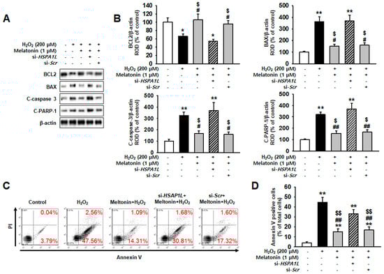 Yoon, Y.M.; Kim, H.J.; Lee, J.H.; Lee, S.H. Melatonin Enhances Mitophagy by Upregulating Expression of Heat Shock 70 kDa Protein 1L in Human Mesenchymal Stem Cells under Oxidative Stress. Int. J. Mol. Sci. 2019, 20, 4545. https://doi.org/10.3390/ijms20184545