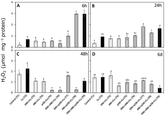 The levels of H2O2 were measured as an indicator of ROS imbalance (Figure 1). At 6 h, all treatments compared with control samples induced a significantly higher accumulation of H2O2, especially treatments with combinations of inhibitors that included p38i (Figure 1A). Treatments that had significantly higher levels than those of T2 (copper only) were: Cu + ERKi + JNKi (T6) and Cu + ERKi + JNKi + p38i (T9). Similar patterns were observed at 24 h, although the Cu + ERKi + p38i (T7) and Cu + ERKi + JNKi + p38i (T9) treatments were the ones with significantly higher levels of H2O2 (Figure 1B). Inverted patterns could be detected at 48 h and 6 d, where concentrations of H2O2 in all treatments containing copper and inhibitors were either the same as or significantly lower than control and copper-only treatments (Figure 1C,D).