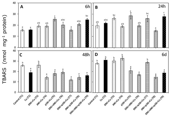 Thiobarbituric acid reactive substances (TBARS) accumulation in U. compressa under copper and/or exposure to MAPK inhibitors. Treatments consisted in: T1) control only with seawater; T2) solely copper exposure as 10 µM of CuSO4 (Cu); T3) copper + 5 µM MAPK ERK inhibitor PD98059 (Cu + ERKi); T4) copper + 5 µM MAPK JNK inhibitor SP600125 (Cu + JNKi); T5) copper + MAPK p38 inhibitor SB203580 (Cu + p38i); T6) Cu + ERKi + JNKi; T7) Cu + ERKi + p38i; T8) Cu + p38i + JNKi; and T9) Cu + ERKi + JNKi + p38i. Samples were analyzed after 6 h (A), 24 h (B), 48 h (C) and 6 d (D) treatments. Different letters represent significant difference at 95% confidence interval (p < 0.05). Plots are represented as mean ± SE (n = 3).