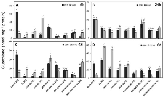 Total reduced (GSH) and oxidised glutathione (GSSG) content in U. compressa under copper and/or exposure to MAPK inhibitors. Treatments consisted in: T1) control only with seawater; T2) Solely copper exposure as 10 µM CuSO4 (Cu); T3) copper + 5 µM MAPK ERK inhibitor PD98059 (Cu + ERKi); T4) copper + 5 µM MAPK JNK inhibitor SP600125 (Cu + JNKi); T5) copper + MAPK p38 inhibitor SB203580 (Cu + p38i); T6) Cu + ERKi + JNKi; T7) Cu + ERKi + p38i; T8) Cu + p38i + JNKi; and T9) Cu + ERKi + JNKi + p38i. Samples were analysed after 6 h (A), 24 h (B), 48 h (C), and 6 d (D) treatments. Different letters represent significant difference at 95% confidence interval (p < 0.05). Plots are represented as mean ± SE (n = 3).