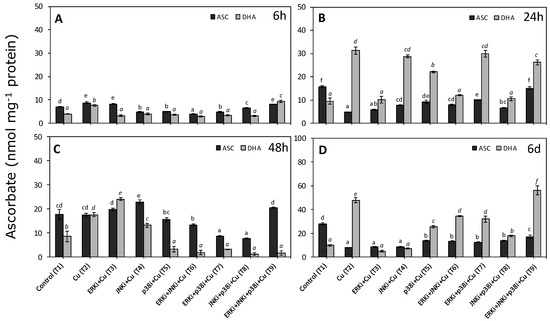 Total reduced ascorbate (ASC) and dehydroascorbate (DHA) concentrations in U. compressa under copper and/or exposure to MAPK inhibitors. Treatments consisted in: T1) control only with seawater; T2) solely copper exposure as 10 µM of CuSO4 (Cu); T3) copper + 5 µM MAPK ERK inhibitor PD98059 (Cu + ERKi); T4) copper + 5 µM MAPK JNK inhibitor SP600125 (Cu + JNKi); T5) copper + MAPK p38 inhibitor SB203580 (Cu + p38i); T6) Cu + ERKi + JNKi; T7) Cu + ERKi + p38i; T8) Cu + p38i + JNKi; and T9) Cu + ERKi + JNKi + p38i. Samples were analysed after 6 h (A), 24 h (B), 48 h (C), and 6 d (D) treatments. Different letters represent significant difference at 95% confidence interval (p < 0.05). Plots are represented as mean ± SE (n = 3).