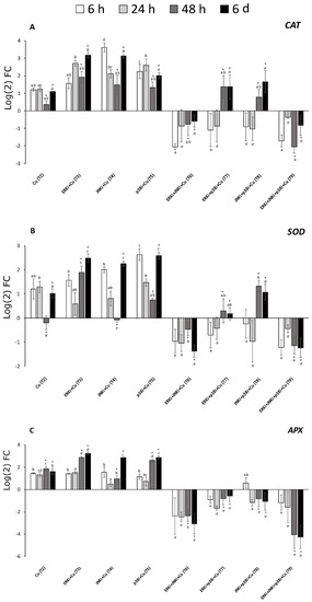 Similar behaviour could be described in the expression of the studied genes. Under copper alone (T2), all genes, at most time points, were upregulated. When the alga was subjected to copper and single inhibitor exposure (T3-T5), the general trend was also upregulation at most time points with an oscillatory pattern of decrease at 24 and 48 h and then increase at 6 d, although there were certain exceptions to this, as for CAT and DHAR (Figure 5A,C, respectively). Conversely, when two or more MAPK pathways were blocked, the general trend was downregulation, even though at most time periods the differences were not significant (Figure 5 and Figure 6). There were several exceptions to this general trend for example, at 48 h and 6 d CAT, SOD, and TRX were upregulated in treatments containing copper and p38i with either ERKi (T7) or JNKi (T8) (Figure 5A,B, and Figure 6A, respectively).