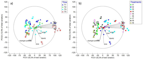 Principal components ordination (PCO) analysis diagrams in relation with time (a): T1: 6 h, T2: 24 h, T3: 48 h, and T4: 6 d; and treatments (b): t1: Control only with seawater, t2: Solely copper exposure as 10 µM of CuSO4 (Cu), t3: copper + 5 µM MAPK ERK inhibitor PD98059 (Cu + ERKi), t4: Copper + 5 µM MAPK JNK inhibitor SP600125 (Cu + JNKi), t5: Copper + MAPK p38 inhibitor SB203580 (Cu + p38i), t6: Cu + ERKi + JNKi, t7: Cu + ERKi + p38i, t8: Cu + p38i + JNKi, and t9: Cu + ERKi + JNKi + p38i. Vectors overlay (Sperman rank correlation) indicate the relationship between the PCO axes and the parameters H2O2, TBARS (thiobarbituric acid reactive substance), GSH (reduced glutathione), GSSG (oxidised glutathione), ASC (reduced ascorbate), DHA (dehydroascorbate), and relative gene expression catalase (CAT), superoxide dismutase (SOD), dehydroascorbate reductase (DHAR), thioredoxin (TRX), ascorbate peroxidase (APX), and glutathione synthase (GS).