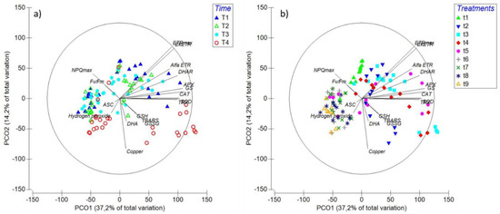 Principal Components Ordination (PCO) analysis diagrams considering the data covered in this article and in the parallel/complementary Celis-Plá et al. [1]. PCOs are related with time (a): T1: 6 h, T2: 24 h, T3: 48 h, and T4: 6 d; and treatments (b): t1: control only with seawater, t2: solely copper exposure as 10 µM CuSO4 (Cu), t3: copper + 5 µM MAPK ERK inhibitor PD98059 (Cu + ERKi), t4: copper + 5 µM MAPK JNK inhibitor SP600125 (Cu + JNKi), T5: copper + MAPK p38 inhibitor SB203580 (Cu + p38i), t6: Cu + ERKi + JNKi, t7: Cu + ERKi + p38i, t8: Cu + p38i + JNKi, and t9: Cu + ERKi + JNKi + p38i. Vectors overlay (Sperman rank correlation) indicate the relationship between the PCO axes and the parameters H2O2, TBARS (thiobarbituric acid reactive substance), GSH (reduced glutathione), GSSG (oxidised glutathione), ASC (reduced ascorbate), DHA (dehydroascorbate), and relative gene expression catalase (CAT), superoxide dismutase (SOD), dehydroascorbate reductase (DHAR), thioredoxin (TRX), ascorbate peroxidase (APX), and glutathione synthase (GS). Furthermore, the physiological variables intracellular copper accumulation (copper photoinhibition (Fv/Fm) productivity (ETRmax), efficiency (αETR) and saturation of irradiance (EkETR), accompanied by higher non-photochemical quenching (NPQmax) [1].