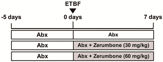 The wild-type ETBF strain secreting BFT-2 (B. fragilis 86-5443-2-2) was used for inducing colitis in C57BL/6 mice. The wild-type Bacteroides strain used in this study is resistant to clindamycin and gentamicin. All bacterial strains were a generous gift from Cynthia Sears and Augusto Franco-Mora (Johns Hopkins University, Baltimore, MD, USA). C57BL/6 mice were administered gentamicin (300 mg/L) and clindamycin (100 mg/L) in the drinking water for five days prior to and throughout the course of bacterial infection. For preparation of bacterial cultures for oral inoculation, overnight cultures of B. fragilis were subcultured at a 1:50 ratio into fresh brain heart infusion broth (BHIB) and grown for 48 h. Bacteria from 50 mL culture were centrifuged at 12,000× g for 20 min. Thereafter, bacteria were resuspended in 1.0 mL phosphate-buffered saline (PBS) to yield a concentration of 109 colony-forming units (CFU)/mL. Bacterial infection was performed by oral gavage of 200 μL of each inoculum. The CFU in each inoculum were confirmed by serial dilution plating on BHIB agar. To determine bacterial colonization in mice, fresh fecal pellets were collected from mice, weighed, and vortexed in 1 mL PBS. Serial 10-fold dilutions were cultured on BHIB agar containing gentamicin and clindamycin to determine CFU/g stool. For each experiment, the mice were divided into six experimental groups (n = 5–12/group). The first group (sham) was kept as the vehicle-treated control, and the second and third groups were given zerumbone (30 or 60 mg/kg/day p.o.). All groups were given antibiotics in drinking water during the experimental period. The other three groups consisted of ETBF-infected mice administrated vehicle (200 μL/20 g/day p.o.,) or zerumbone (30 or 60 mg/kg/day p.o.,) daily for 7 days, according to the experimental design (Figure 1). All materials were dissolved in a vehicle of 0.9% saline. Control groups were given the vehicle daily for 7 days as appropriate. Administration of each drug was initiated simultaneously with oral inoculation of ETBF.