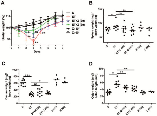 Clinicopathologic analysis of ETBF-infected mice administered with zerumbone. C57BL/6 female mice were infected with WT-ETBF. During ETBF infection, the zerumbone-treated group was orally gavaged with zerumbone (30, 60 mg/kg, p.o., once a day). (A) Body weight. The daily body weight of individual mice was normalized to the starting body weight (%). ET + Z (30) vs. ET, # p < 0.05, ## p < 0.01; ET + Z (60) vs. ET, * p < 0.05, ** p < 0.01; significances between treated groups were determined using Mann–Whitney U test. (B) Spleen weight (mg)/body weight (g). (C) Cecum weight (mg)/body weight (g). (D) Colon weight (mg)/colon length (mm). Colon weight (mg)/colon length (mm) ratio were measured at day 7 post-infection. S, sham; ET, ETBF; Z (30), Zerumbone (30 mg/kg); Z (60), zerumbone (60 mg/kg). Scatter plot. Horizontal bar, median. * p < 0.05, ** p < 0.01, *** p < 0.001. ns, no statistical significance.