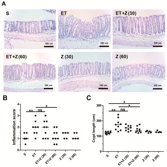 Histopathology analysis of distal colon in ETBF-infected mice. Formalin-fixed paraffin-embedded (FFPE) distal colonic tissues obtained from C57BL/6 mice at day 7 post-infection were stained with hematoxylin and eosin (HE). Representative images are shown. Histologic scores were evaluated using HE slides. S, sham; ET, ETBF; Z (30), Zerumbone (30 mg/kg); Z (60), Zerumbone (60 mg/kg). (A) Histology of distal colon, ×200 magnification; Scale bar, 100 μm, (B) Inflammation score. (C) Crypt length. Scatter plot. Horizontal bar, median. * p < 0.05, ** p < 0.01. ns, no statistical significance.