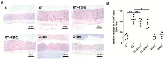 Histological analysis of macrophage infiltration in distal colon of ETBF-infected mice. FFPE distal colonic tissues obtained from mice at day 7 post-infection were stained with anti-F4/80 antibody and counterstained with hematoxylin. Representative images are shown. S, sham; ET, ETBF; Z (30), Zerumbone (30 mg/kg); Z (60), Zerumbone (60 mg/kg). (A) Immunohistochemistry (IHC) for F4/80+ cells, ×200 magnification; Scale bar, 100 μm. (B) Median number of F4/80+ cells at 200× field. Scatter plot. Horizontal bar, median. * p < 0.05, ** p < 0.01. ns, no statistical significance.
