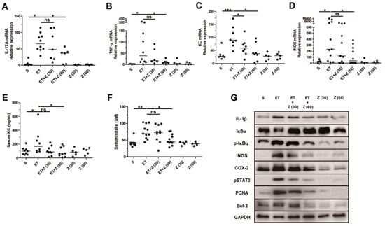Analysis of expression of pro-inflammatory genes and proteins in distal colon of ETBF-infected mice. Distal colon was analyzed for mRNA expression of IL-17A, TNF-α, KC, and iNOS by RT-PCR. Serum KC level was examined by ELISA. Serum nitrite level was examined by nitric oxide assay. S, sham; ET, ETBF; Z (30), Zerumbone (30 mg/kg); Z (60), Zerumbone (60 mg/kg). (A) IL-17A expression. (B) TNF-α expression. (C) KC expression. (D) iNOS expression. (E) Serum KC. (F) Serum nitrite. (G) Western blot analysis of lysate in distal colon. Scatter plot. Each dot represents one mouse. Horizontal bar, median. * p < 0.05, ** p < 0.01, *** p < 0.001. ns, no statistical significance.