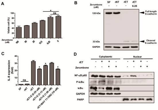 BFT treatment of human colonic carcinoma cell line HT29/C1 leads to cleavage of E-cadherin (a component of adherence junction), yielding a 33 kDa cytoplasmic E-cadherin fragment [12,17]. The cleavage of E-cadherin in turn induces NF-κB signaling and IL-8 expression [20]. To determine if the protective effects exerted by zerumbone in mice was due to inhibition of E-cadherin cleavage, BFT-treated HT29/C1 cells were cultured with zerumbone and E-cadherin cleavage examined in vitro. First, to determine the highest concentration of zerumbone that does not induce cytotoxicity, HT29/C1 cells were cultured with various concentrations of zerumbone (6.25 to 100 μM) for 24 h and cell viability determined by trypan blue exclusion assay. Results show that cell viability of HT29/C1 cells appears to decrease from 12.5 μM and higher concentration of zerumbone (Figure 6A). Therefore, we used 6.25 μM of zerumbone to evaluate the effects of zerumbone on BFT-induced E-cadherin cleavage, NF-κB signaling, and IL-8 expression in vitro.